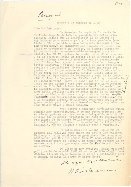 [Carta] 1952 feb. 1, Génova, [Italia] [a] Gabriela [Mistral] [manuscrito] [Humberto] Díaz-Casanueva.