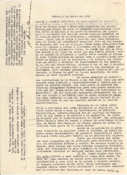 [Carta] 1952 mar. 27, Génova, [Italia] [a] Gabriela [Mistral] [manuscrito] [Humberto] Díaz-Casanueva.