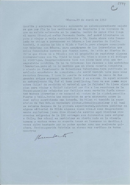 [Carta] 1952 abr. 29, Génova, [Italia] [a] Gabriela [Mistral] [manuscrito] Humberto [Díaz-Casanueva].