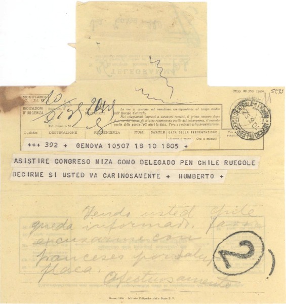 [Telegrama] 1952 jun. 10, Génova, [Italia] [a] Gabriela Mistral, Nápoles, [Italia] [manuscrito] Humberto [Díaz-Casanueva].