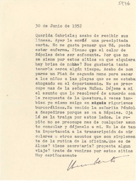 [Carta] 1952 jun. 30 [a] Gabriela [Mistral] [manuscrito] Humberto [Díaz-Casanueva].