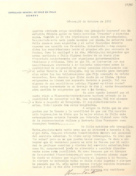 [Carta] 1952 oct. 20, Génova, [Italia] [a] Gabriela [Mistral] [manuscrito] Humberto [Díaz-Casanueva].