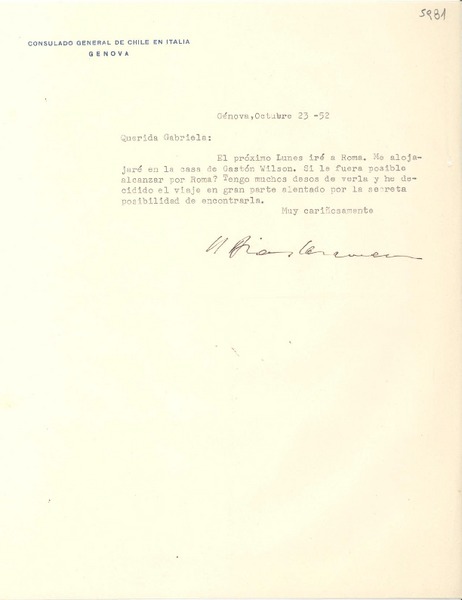 [Carta] 1952 oct. 23, Génova, [Italia] [a] Gabriela [Mistral] [manuscrito] [Humberto] Díaz-Casanueva.