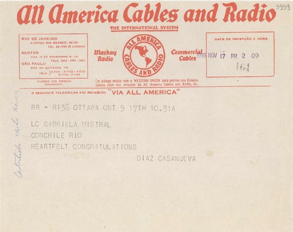 [Telegrama] 1945 nov. 17, Ottawa [Canada] [a] Gabriela Mistral, Río de Janeiro [manuscrito] Díaz Casanueva.
