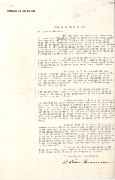 [Carta] 1950 jun. 30, Lima [a] Gabriela Mistral [manuscrito] Díaz Casanueva.