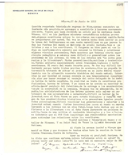 [Carta] 1952 jun. 28, Génova [a] Gabriela Mistral [manuscrito] Humberto Díaz-Casanueva.