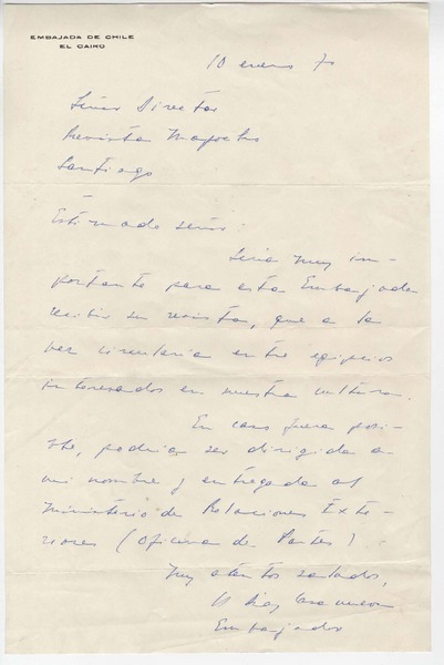 [Carta] 1970 ene. 10, El Cairo, Egipto [al] Director de la Revista Mapocho [manuscrito] Humberto Díaz-Casanueva.