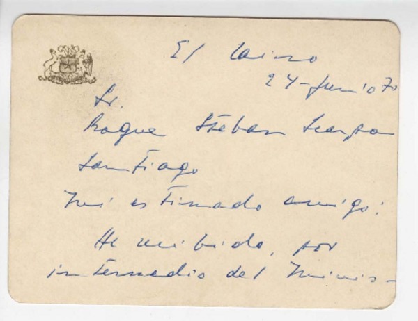 [Tarjeta] 1970 jun. 24, El Cairo, Egipto [a] Roque Esteban Scarpa [manuscrito] Humberto Díaz-Casanueva.