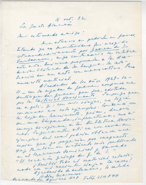[Carta] 1992 oct. 16, Santiago, Chile [a] Justo Alarcón Reyes [manuscrito] Humberto Díaz-Casanueva.