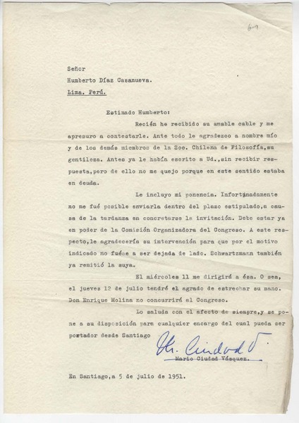 [Carta] 1951 jul. 5, Lima, Perú [a] Mario Ciudad Vásquez [manuscrito] Humberto Díaz-Casanueva.