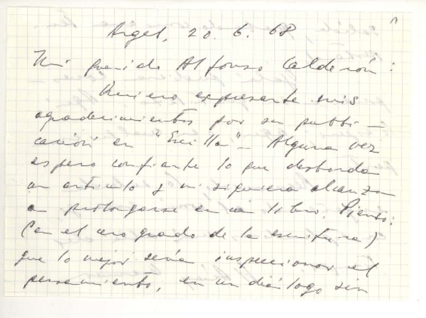 Argelia [a] Alfonso Calderón, Santiago, Chile Carta, 20 de junio de 1968, [manuscrito] Humberto Díaz Casanueva