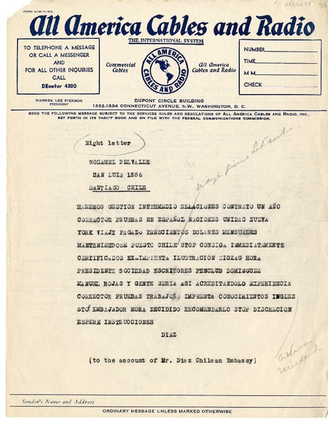 [Telegrama] [1946], Washington D. C. [a] Rosamel del Valle [manuscrito] Humberto Díaz-Casanueva.