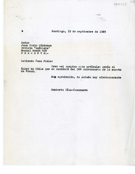 [Carta] 1989 septiembre 19, Santiago, Chile [a] Juan Pablo Cárdenas, Revista "Análisis" [manuscrito] Humberto Díaz-Casanueva.