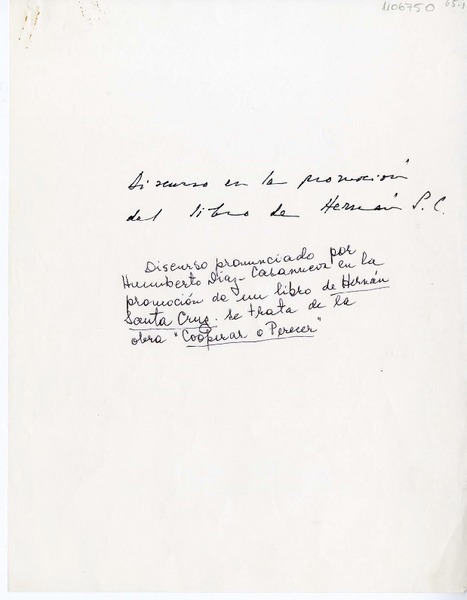 Discurso en la promoción del libro de Hernán Santa Cruz [manuscrito] Humberto Díaz-Casanueva.
