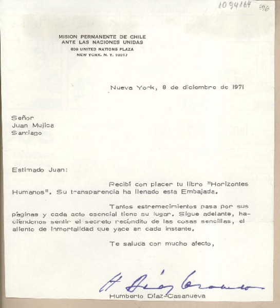 [Carta] 1971 diciembre 8, New York [a] Juan Mujica, Santiago, Chile [manuscrito] Humberto Díaz-Casanueva.