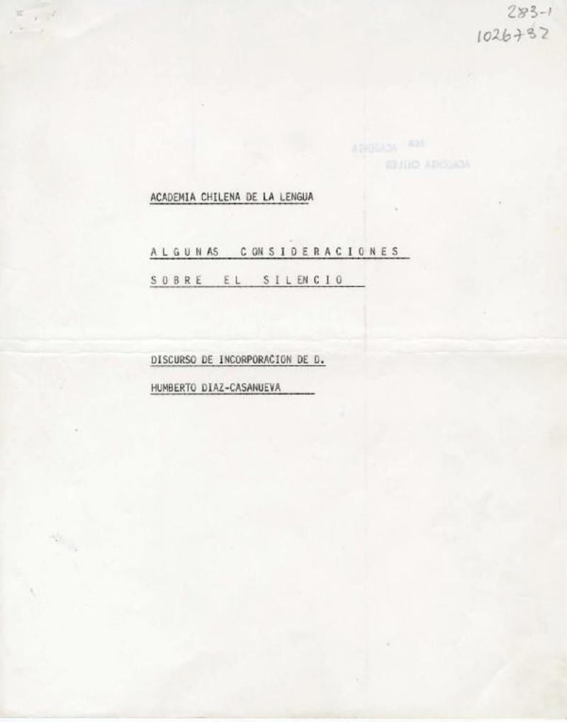 Algunas consideraciones sobre el silencio [Discurso] [manuscrito] Humberto Díaz-Casanueva.