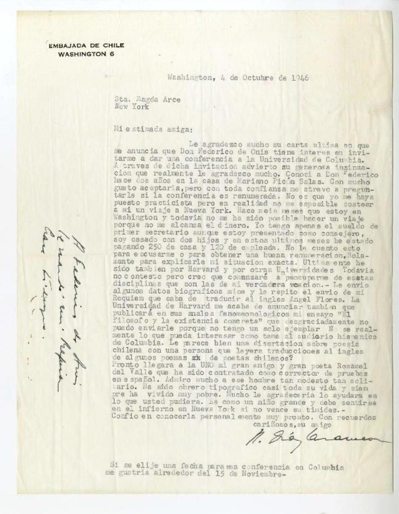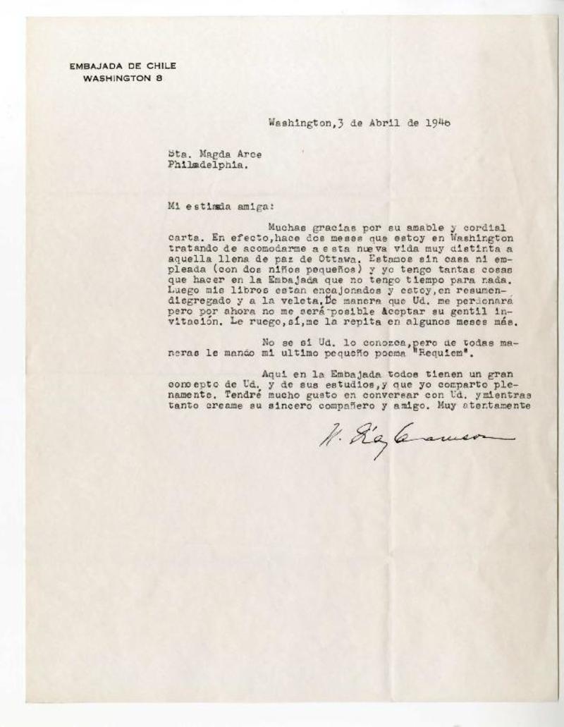 Washington [a] Magda Arce carta, 1946 , [manuscrito] Humberto Díaz Casanueva.