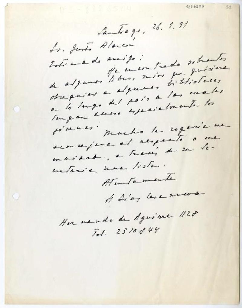 Santiago, Chile [a] Justo Alarcón Reyes Carta, 1991 marzo 26, [manuscrito] Humberto Díaz-Casanueva.