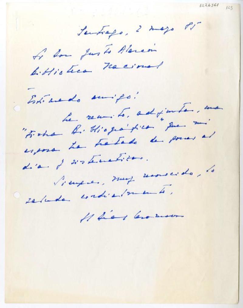 Santiago, Chile [a] Justo Alarcón Reyes Carta, 1985 mayo 2 , [manuscrito] Humberto Díaz Casanueva.