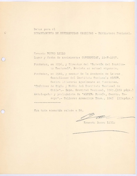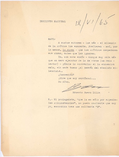 [Carta] 1965 jun. 12, Santiago, Chile [a] Raúl Silva Castro [manuscrito] Ernesto Boero Lillo.
