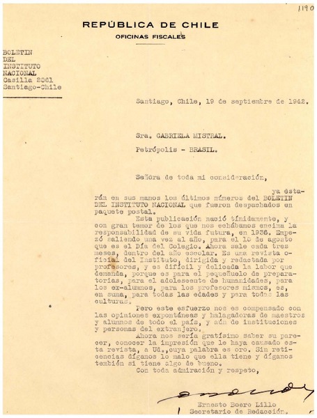 [Carta] 1942 sept. 19, Santiago, Chile [a] Gabriela Mistral, Petrópolis, Brasil [manuscrito] Ernesto Boero Lillo.