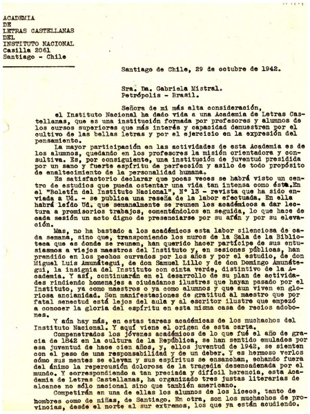 [Carta] 1942 oct. 29, Santiago, Chile [a] Gabriela Mistral, Petrópolis, Brasil [manuscrito] Ernesto Boero Lillo.