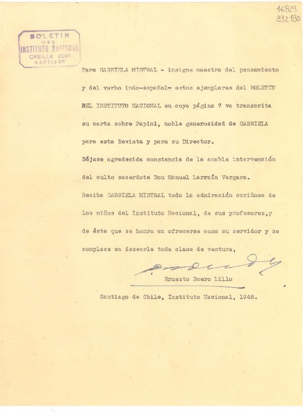 [Carta] 1948, Santiago de Chile [a] Gabriela Mistral [manuscrito] Ernesto Boero Lillo.