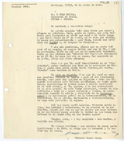 [Carta] 1949 julio 24, Santiago, Chile [a] Juan Mujica, Bilbao, España [manuscrito] Ernesto Boero Lillo.