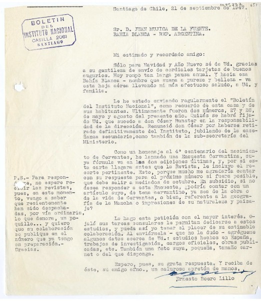 [Carta] 1947 septiembre 21, Santiago, Chile [a] Juan Mujica, Bahía Blanca, Argentina [manuscrito] Ernesto Boero Lillo.