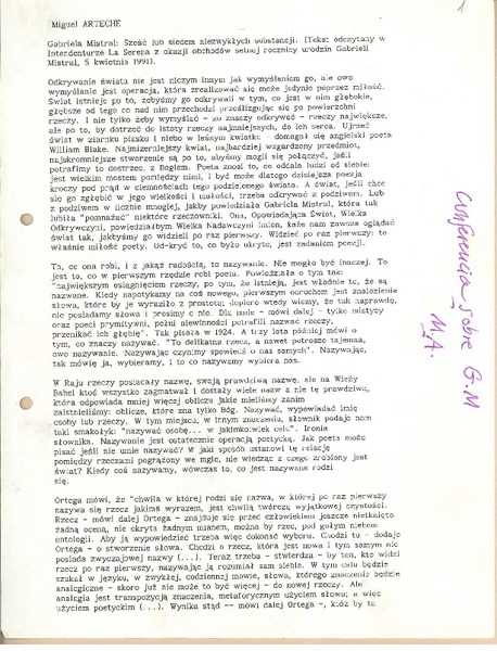 [Conferencia sobre Gabriela Mistral] [manuscrito] Miguel Arteche; traducido al polaco por Anna Sieprawska.