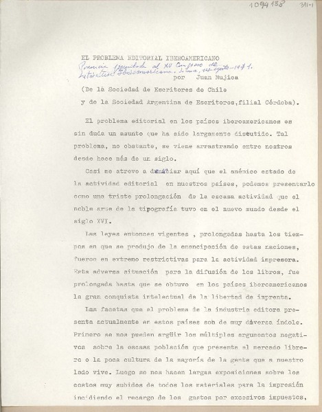 El problema editorial iberoamericano [manuscrito] Juan Mujica de la Fuente.
