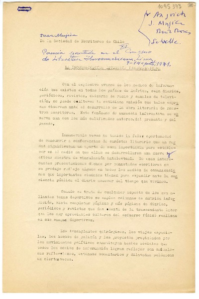 La incomunicación literaria iberoamericana [manuscrito] Juan Mujica.