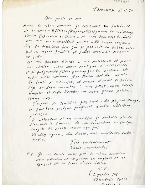 [Carta] 1990 noviembre 8, Thessaloniki, Grecia [a] Humberto Díaz-Casanueva [manuscrito] Takis Varvitsiotis.