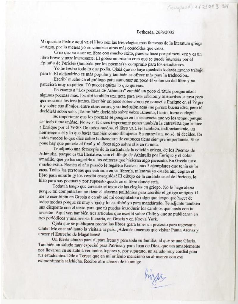 Bethesda, Maryland [a] Pedro Lastra Carta, 26 de junio 2005, [manuscrito] Regas Kapattos.