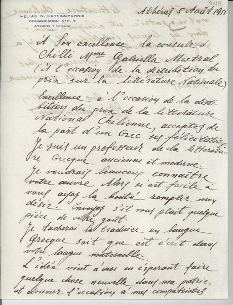 [Carta] 1951 août 5, Atenas, [Grecia] [a] Gabriela Mistral] [manuscrito] Helias N. Catsicoyannis.