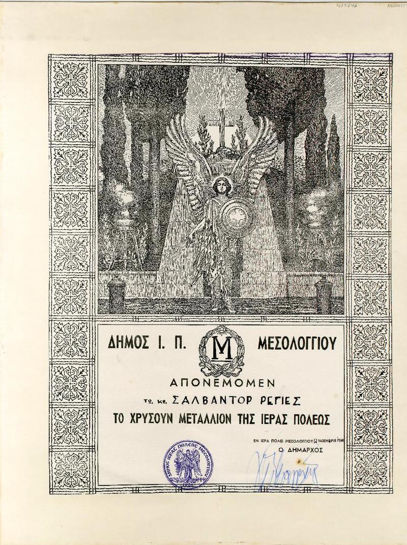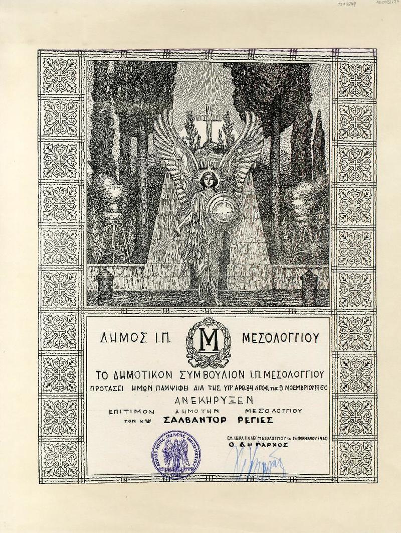 Mesologni, Grecia [a] Salvador Reyes Diploma, 1960 noviembre 12, [manuscrito] Municipalidad de la Sagrada Ciudad de Mesolonyi (Grecia).
