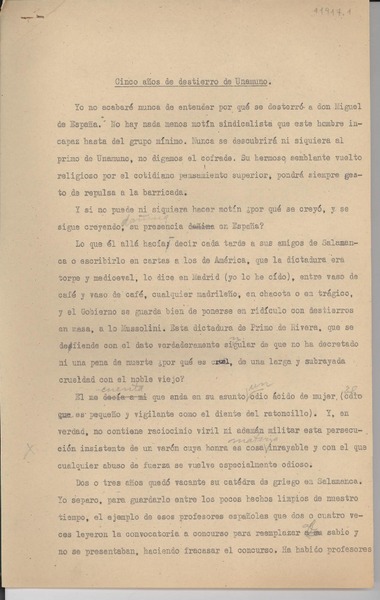 Cinco años de destierro de Unamuno [manuscrito] Gabriela Mistral.
