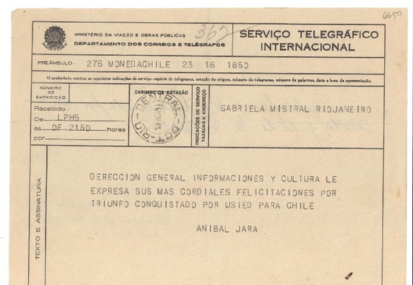 [Telegrama] 1945 nov. 16, [Santiago], Chile [a] Gabriela Mistral, Rio de janeiro, [Brasil] [manuscrito] Aníbal Jara [Letelier].