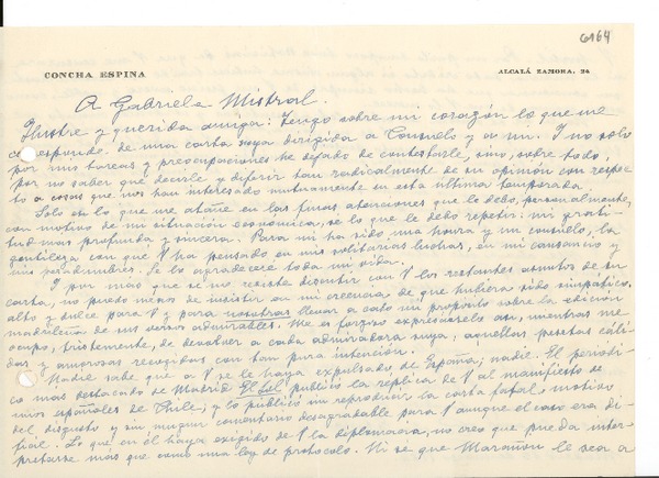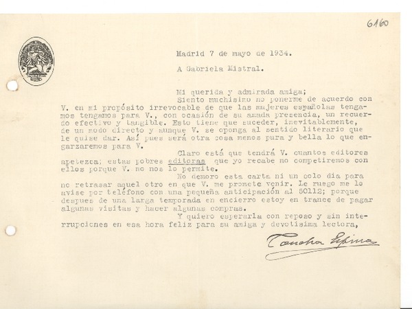 [Carta] 1934 mayo 7, Madrid, [España] [a] Gabriela Mistral [manuscrito] Concha Espina.