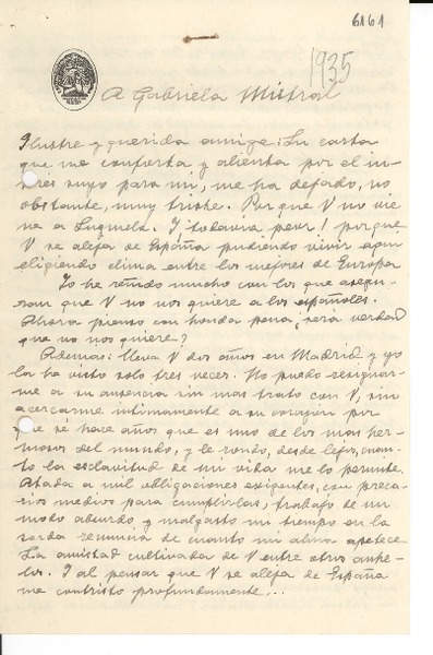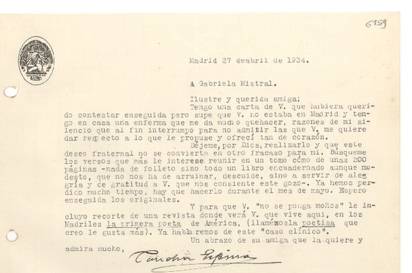 [Carta] 1934 abr. 27, Madrid [a] Gabriela Mistral [manuscrito] Concha Espina.