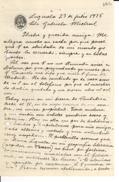 [Carta] 1935 jul. 23, Luzmela, [España] [a] Gabriela Mistral [manuscrito] Concha Espina.