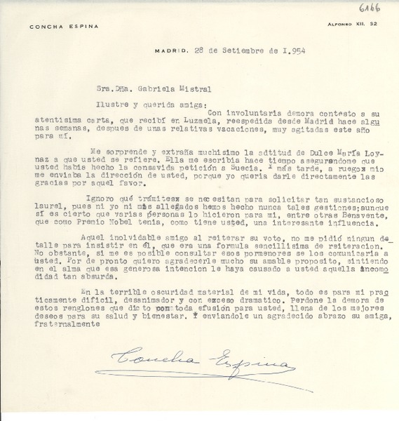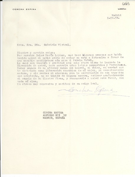 [Carta] 1954 abr. 1, Madrid, [España] [a] Gabriela Mistral [manuscrito] Concha Espina.