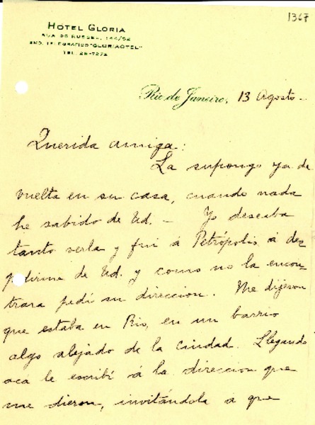 [Carta] [1945?] ago. 13, Rio de Janeiro, [Brasil] [a] [Gabriela Mistral] [manuscrito] Carmela Mackenna.
