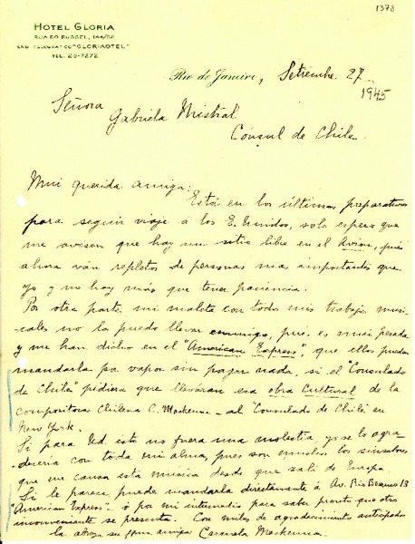 [Carta] [1945?] sept. 27, Río de Janeiro, [Brasi] [a] Gabriela Mistral, [Brasil] [manuscrito] Carmela Mackenna.