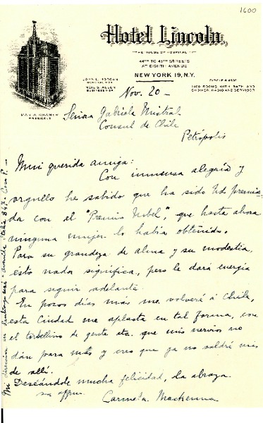 [Carta] [1945?] nov. 20, New York, [EE.UU.] [a] Gabriela Mistral, Petrópolis, [Brasil] [manuscrito] Carmela Mackenna.