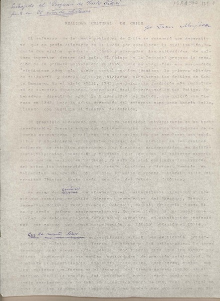Realidad cultural de Chile [manuscrito] Juan Mujica de la Fuente.