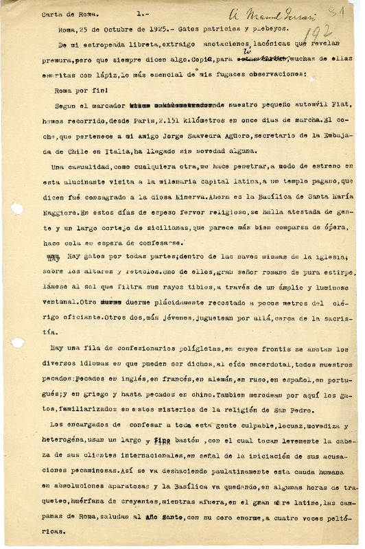 Carta a Roma [manuscrito] Alberto Ried Silva.