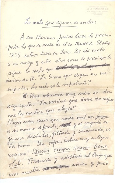 Causa permanente de malestar nacional [manuscrito] Joaquín Edwards Bello.