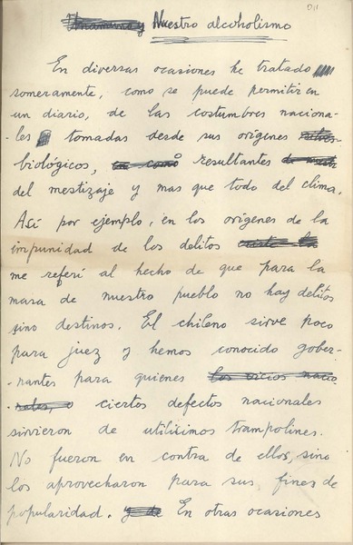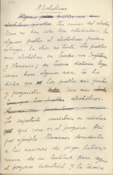 Alcoholismo [manuscrito] Joaquín Edwards Bello.