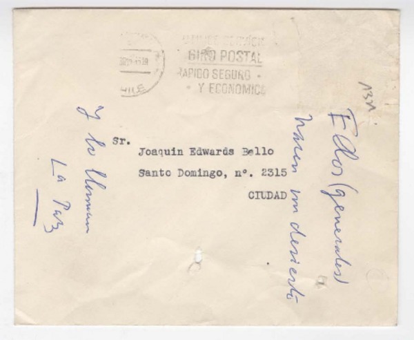 Santiago [manuscrito] Joaquín Edwards Bello.